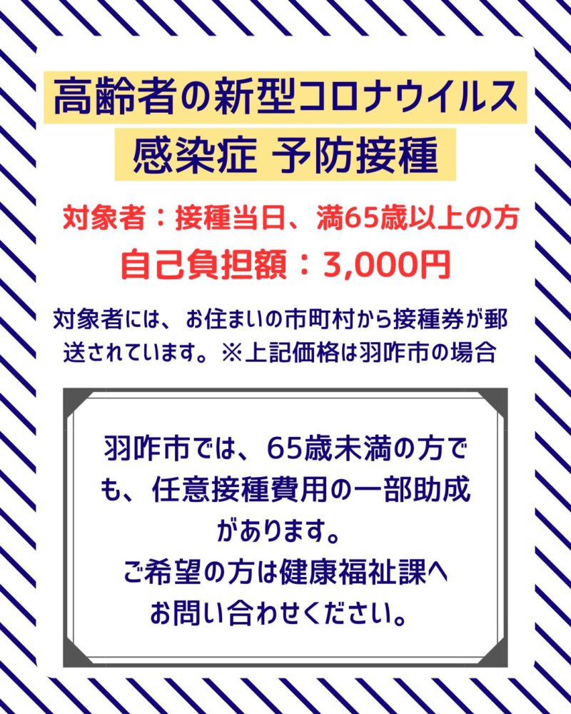 羽咋市の65歳以上の方の場合、インフルエンザは1,000円、新型コロナワクチンは3,000円で接種することが可能です。