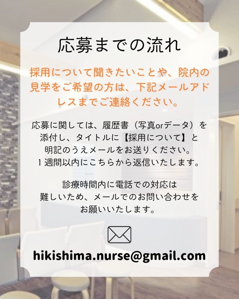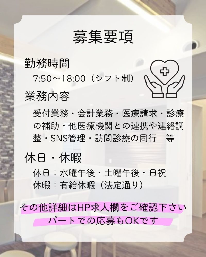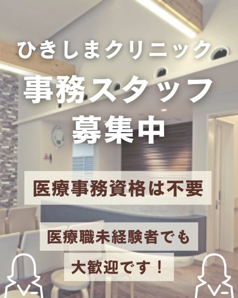 カテゴリーお知らせ事務スタッフ募集についてお知らせ2026.02.05ひきしまクリニックでは、現在事務スタッフを募集しております。医療事務の資格は必要ありません!募集要項を見てご興味を持っていただいた方は、お気軽にメールにてお問い合わせください。詳細は、HPの求人情報ページにも記載してあるので、ご覧ください。