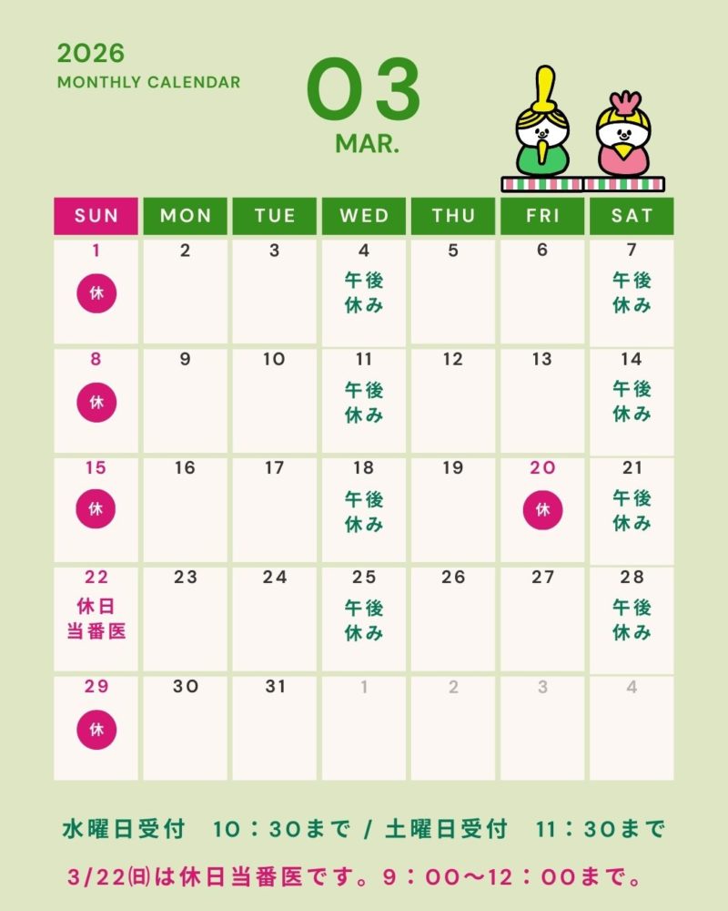 カテゴリーお知らせ3月診療カレンダーお知らせ2026.03.023月の診療カレンダーです🌸3/22㈰は休日当番医です。電話にてお問い合わせください。三寒四温のこの頃、寒暖差がありますので、新年度に向けて体調に気を付けてお過ごしください。