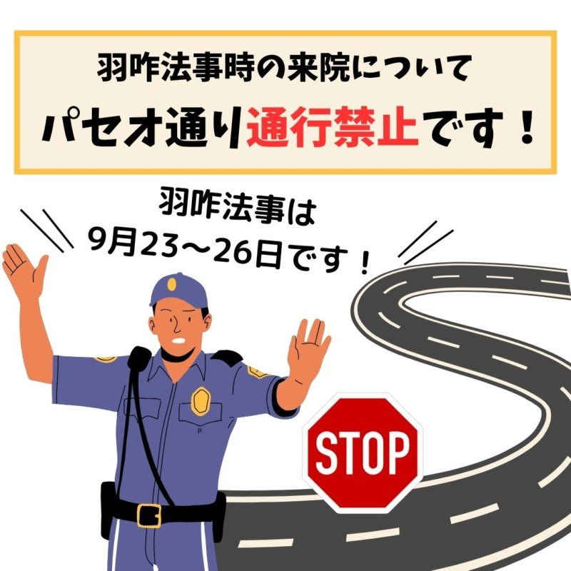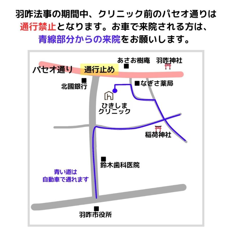 カテゴリーお知らせ9/23~26の通行規制についてお知らせ2025.09.18いよいよ来週から羽咋法事が始まります。毎年のことですが、羽咋法事の期間中、パセオ通りは車で通れません。来院の際は画像を参考にしてください。9/23(火・祝)はクリニックお休みですが、24日(水)~26日(金)は通常診療しております。また、法事期間中は当院の駐車場も無料で開放しておりますので、行かれる方はどうぞご利用ください。